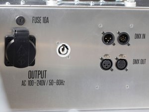 3 and 5 pin XLR sockets for DMX as well as PowerCON In and Out-